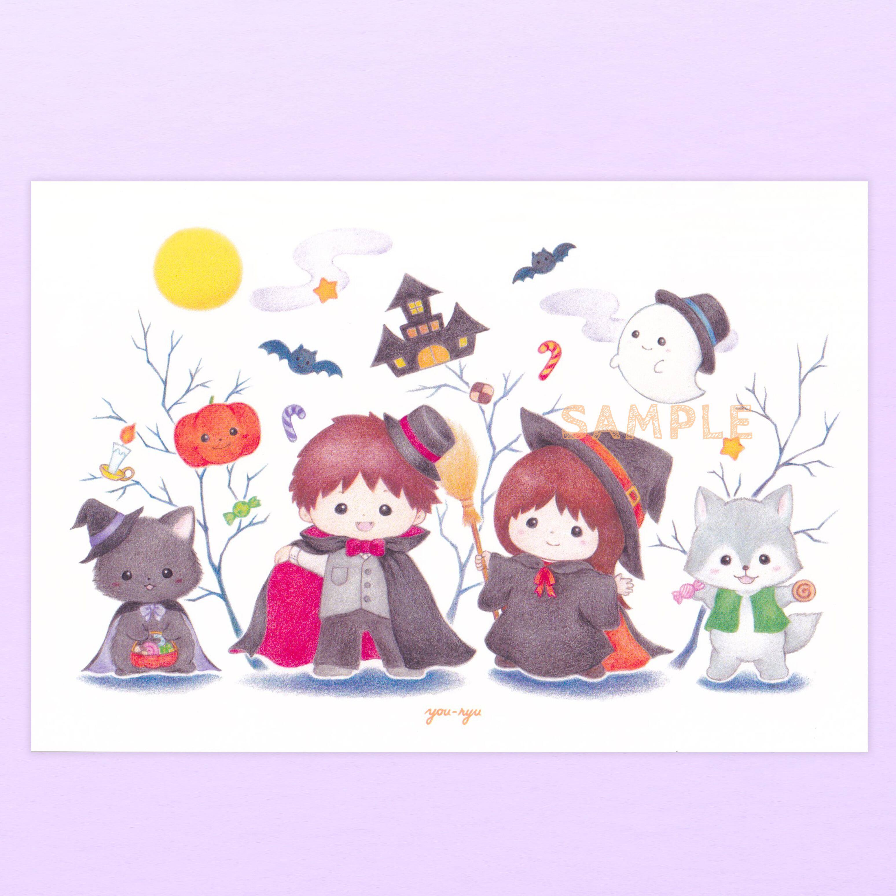 皆で仲良く楽しんでいるハロウィンのポストカードです。