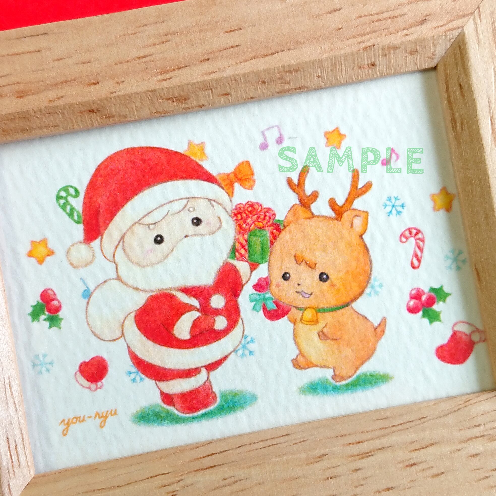 クリスマスダンスを踊るサンタさんとトナカイちゃんの額付ミニイラストです。